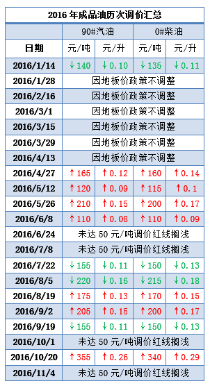 若本次下调落实,将为2016年国内成品油的第五次下调。今年国内成品油价格调整共经历二十一轮,呈现“七涨、四、六暂停、四搁浅”的格局。11月16日24时,汽柴油调价窗口将如期开启。