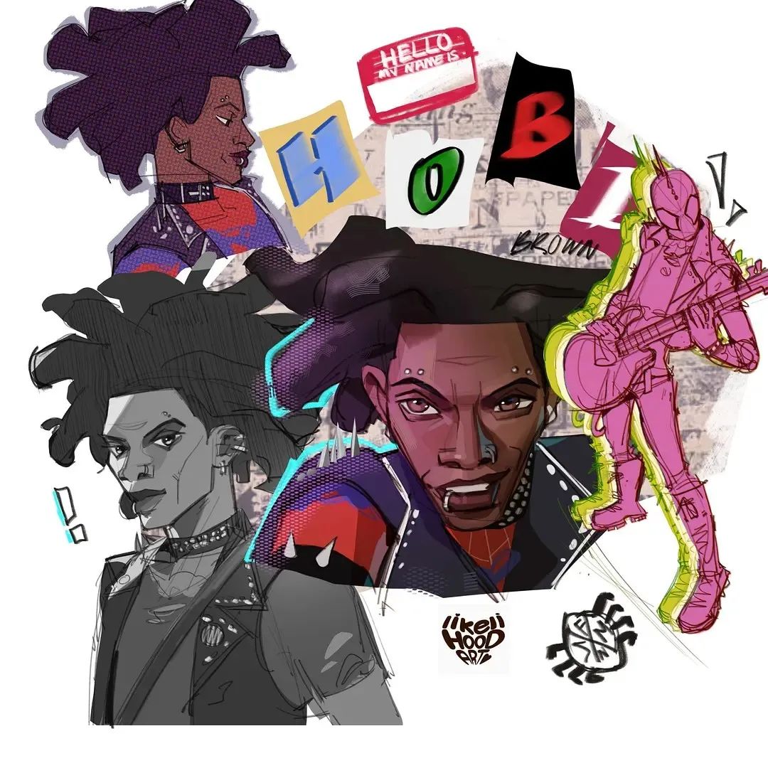 从人物设计,到角色个性,霍比都是蜘蛛侠群体里相当另类的存在。霍比的首次亮相是2015年《超凡蜘蛛侠》第10期,作为”新时代”的蜘蛛侠,漫画中的霍比就是身着铆钉背心,留着莫霍克发型,身背一把吉他,满满的朋克范儿。作为蜘蛛侠,他的任务是领导自由战士对抗不公正的权力,也因此他被称作无政府主义者。也难怪在电影里,他会说出“那是资本主义的象征。”此外,他还是一名朋克摇滚明星,会在乐队里演奏,也会去酒吧同男同胞们享乐。