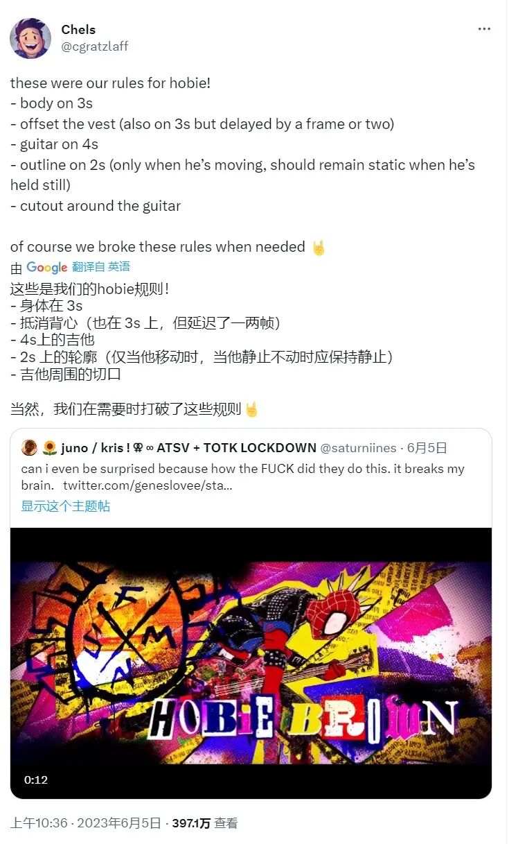 当霍比动起来的时候,身体、背心和吉他之间因为不连贯而产生了一定的错位感,这是《平行宇宙》里的蜘蛛侠们从未曾出现过的动作设定。《纵横宇宙》是如何制作出霍比动作的?电影的动画监制切尔西·戈登-拉特茨拉夫在推特上回应了影迷的提问。