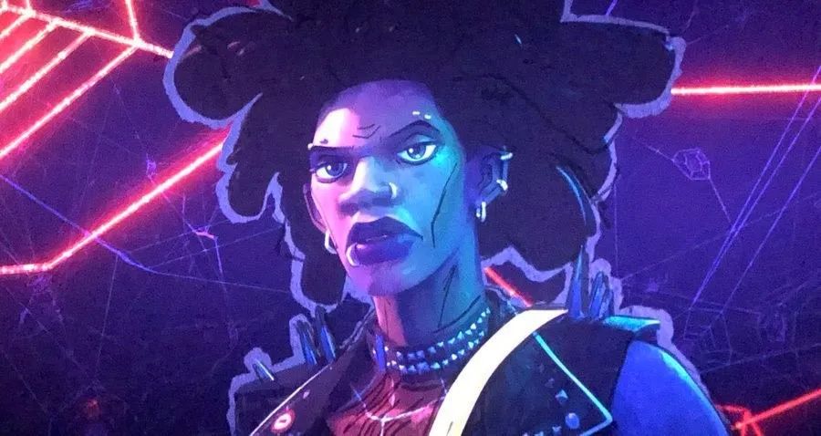 为了配合朋克蜘蛛侠的登场,电影也为其创作了一首纯正的朋克摇滚乐,用大量密集的鼓点配合简单的旋律,带给人激烈的感受。视听层面的所有的设计都是为角色服务,《纵横宇宙》中的霍比尽管要背负蜘蛛侠的责任,然而他内心却并不顺从这种制度——这倒是非常符合朋克蜘蛛侠的原始设定。所以也不就难理解,以下这些情节:当蜘蛛侠2099给迈尔斯讲述蜘蛛侠的宿命论时,霍比在一旁看似冷漠实际上是在引导迈尔斯;当2099要求蜘蛛侠们追击迈尔斯的时候,霍比摘下手环表示“老子不干了”出人意料地退出这场行动;而当格温的手环失灵被困在自己的宇宙中时,她的父亲送来的礼物,竟然是霍比带给她的手环。