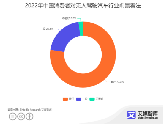 据iiMedia Research(艾媒咨询)的数据,在2022年中国消费者对无人驾驶汽车行业前景看法中,77.3%消费者表示看好,20.5%消费者表示一般,2.2%消费者表示不看好。