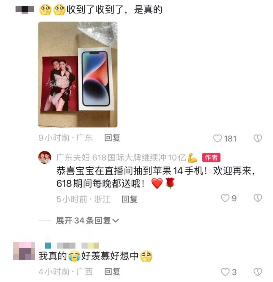 “前2个小时每分钟送8台iPhone14!大家一定要来蹲!”开播前半个月,广东夫妇就已经在多条短视频中为6月1日首场直播福利进行预热,号称准备1万台苹果手机在直播间用于免费抽奖。无独有偶,在同为头部带货主播的贾乃亮618直播间中,也拿出了送苹果手机的架势,并且将福利提高到每分钟送10台iPhone14。评论区中,很多网友们都在讨论有没有抽中苹果手机。