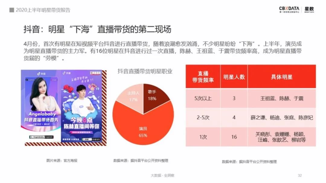 从签约罗永浩到陈赫入场,再到官宣Angelababy,抖音可以说是冲在明星直播的前列。但首秀即巅峰,薅完就跑的情况广泛出现在大部分入驻抖音的明星主播身上。根据CBNData星数截至2020年6月底统计的带货明星数据中,有8位明星仅在抖音进行过一次直播带货,进行过5次以上的直播带货的明星仅有王祖蓝一人。