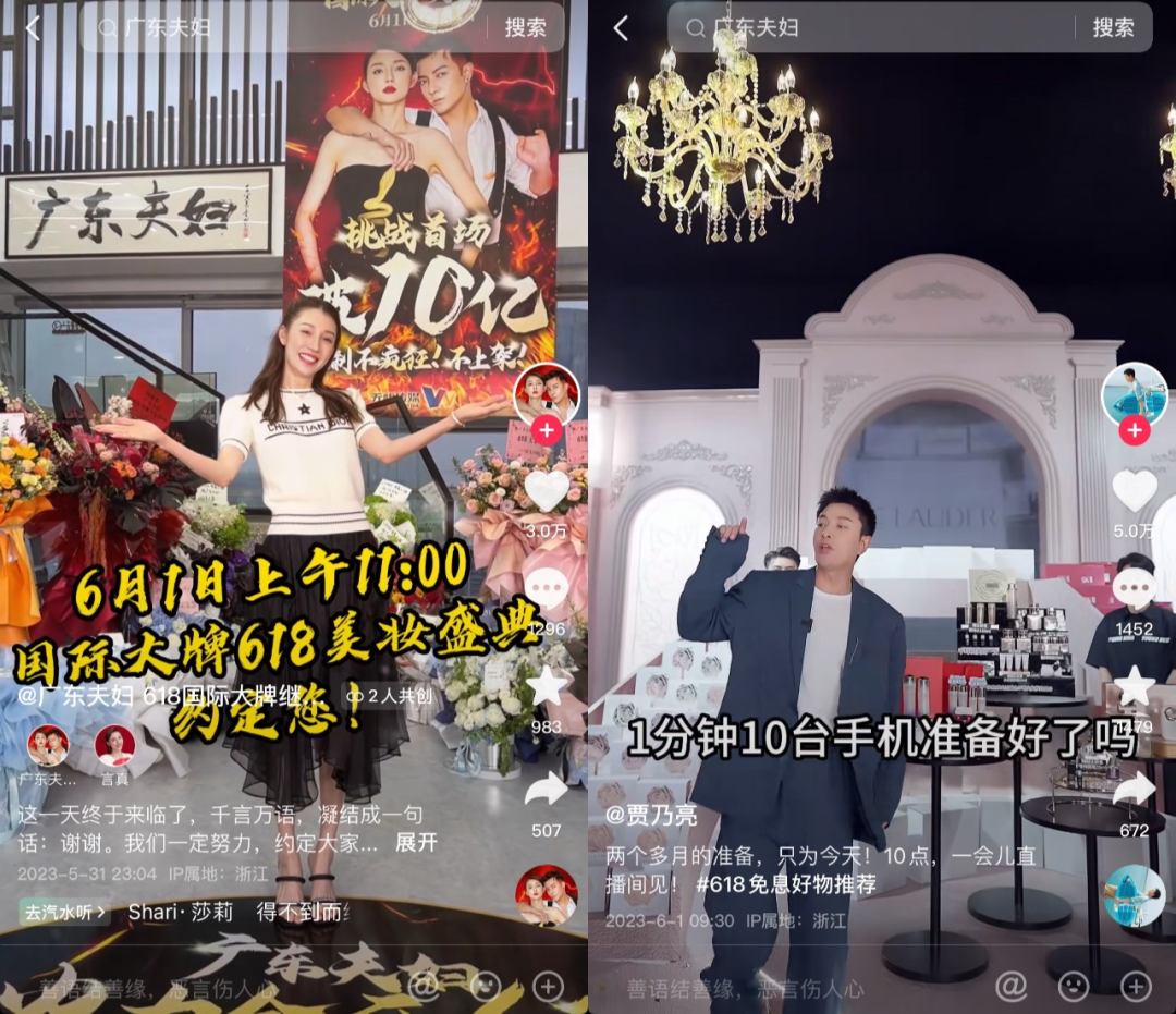 在6月1日同天开播的广东夫妇、贾乃亮直播间中,首场直播带货主题皆是国际大牌美妆,具备高单价和受众面广的“硬通货”特点,可以通过自组SKU套组的形式进行差异化销售,绕过同款比价的环节。
