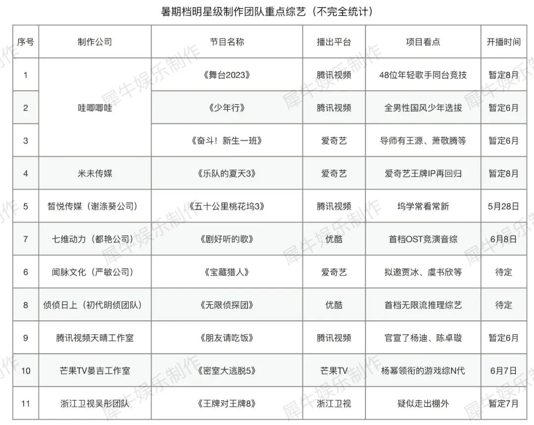 这个暑期档,除了是平台的注意力之争,也是明星级综艺制作公司的开发力之争。全盘梳理下来,犀牛君发现,这些明星制作人将在今夏推出近11部综艺新作。(见下表)