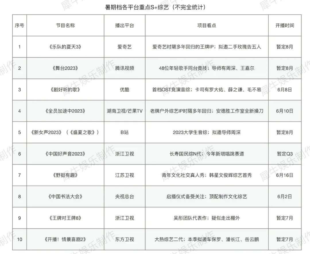 根据犀牛君统计,今年暑期档台网各平台都会至少推出一档举平台之力制作的S+,这场各平台项目的巅峰对决大概有10名种子选手参赛。(见下表)