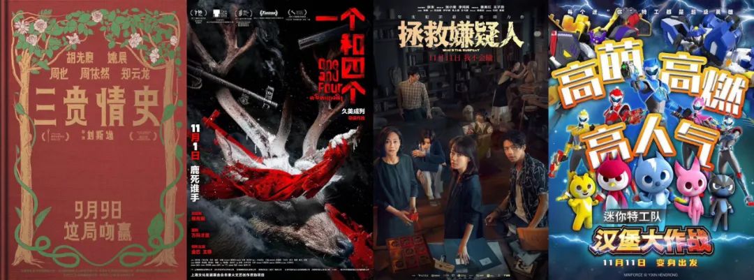 由胡先煦、姚晨、周也、周依然、郑云龙等主演的奇幻童话电影《三贵情史》,在推介会上宣布定档9月9日。曾入围多个电影节的万马才旦监制、久美成列执导影片《一个和四个》,则选中了11月1日的档期。另外还有张小斐主演的悬疑片《拯救嫌疑人》,低龄向动画《迷你特工队之汉堡大作战》看中了“光棍节”的节日增量,即将在11月11日同日对决。