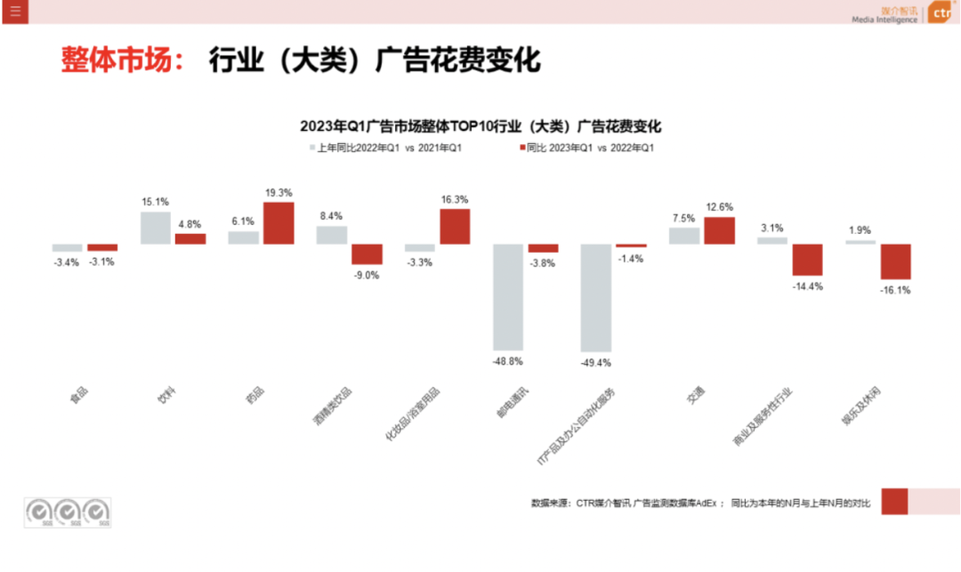 好消息是,从大盘来看,2023年的广告市场整体都在理性复苏——CTR数据显示,2023年Q1广告市场同比减少4.5%,较去年同期跌幅略有收窄。3月份广告市场花费同比增长0.2%,月度花费环比增长11.7%,同比与环比变化较上月均由负转正。而聚焦到互联网行业,根据QuestMobile发布的《2023中国移动互联网春季大报告》,今年Q1互联网广告市场规模同比增长2.3%。