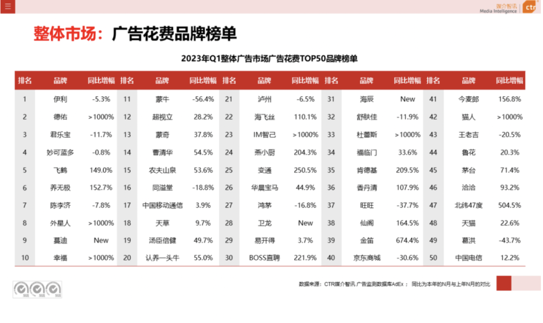 结合Q1整体广告市场中广告花费TOP50的品牌榜单来看,有长期“撒钱投投投”的营销大户,也有诸多出乎意料的黑马新品牌,以及收缩投放战线的品牌,广告主的投放动作呈两级分化。
