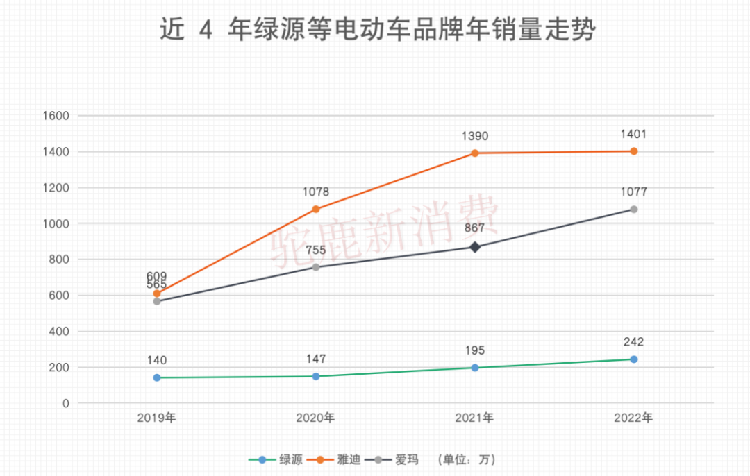 据驼鹿新消费整理的数据来看,绿源2022 年销量虽然同比增长了22%至242 万辆,但是仍远落后于雅迪和爱玛,值得一提的是,爱玛 2022 年销量更是同比增长了24%至1077 万辆。走势上看,绿源销量增幅不及两大头部企业,且差距也越拉越大。