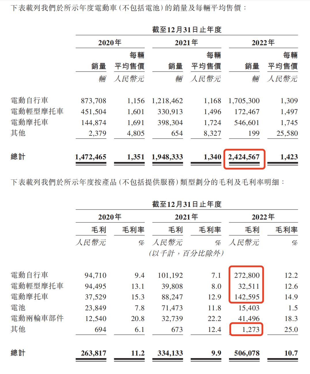 毛利,是公司最基本、最稳定的利润来源,是公司主营业务是否长期稳定盈利的具体表现。以 2022 年为例,绿源集团电动车(电动自行车、电动轻型摩托车、电动摩托车、其他)销量达 242 万辆,按照对应毛利合计4.48 亿元计算,相当于每辆车的毛利仅185元。而按同比口径计算,同年,雅迪每辆车毛利超400元,是绿源的2.15 倍。
