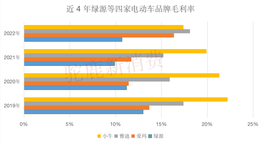 驼鹿新消费还整理了一个更直观的毛利率数据。可以看到,近4 年来,绿源的毛利率常年垫底,和雅迪、爱玛等同行企业之间的差距也越来越大。