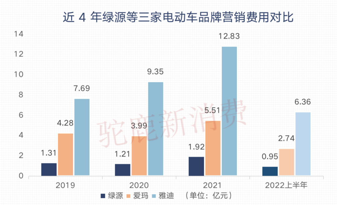 从绿源在近 20 年的发展历程来看,与爱玛、雅迪、小牛等电动车品牌重视营销相比,绿源似乎对营销一直不太在意。据驼鹿新消费整理的数据,绿源2019 年至 2021 年三年间累计营销费用 4.44 亿元,且增长变化没有太大,即便加上 2022 年上半年的 0.95 亿元,累计合计 5.39 亿元,连雅迪 2022 年半年的营销费用都没有。