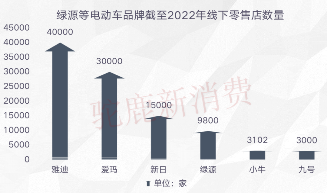 截至2022年12月31日,绿源集团在中国内地布局了超过9800家零售门店。据驼鹿新消费整理,目前国内线下零售门店数最多的电动车品牌为雅迪,其次是爱玛。新品牌小牛、九号等也已布局3000多家门店。