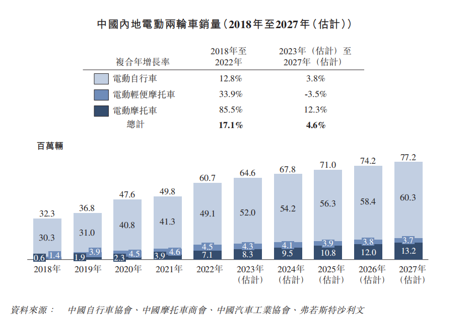 近年来,尤其是2019年新国标颁布后,电动两轮车销售受到一定影响。据弗若斯特沙利文资料显示,2018年至2027年(预计)之间,以2023年为界线,2023年之前,中国内地电动车销量复合年增长率以电动摩托车增长率最高,达85.5%,电动轻型摩托车和电动自行车分别为33.9%、12.8%。2023年后,电动轻便摩托车大幅下降至-3.5%,明显倒退,电动摩托车也从85.5%下降至12.3%,电动自行车则下降至3.8%,各类车型复合年增长率大幅下降。
