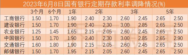 根据多家国有银行发布的公告,6月8日起,2年期定存下调10BP,3年、5年期下调15BP。