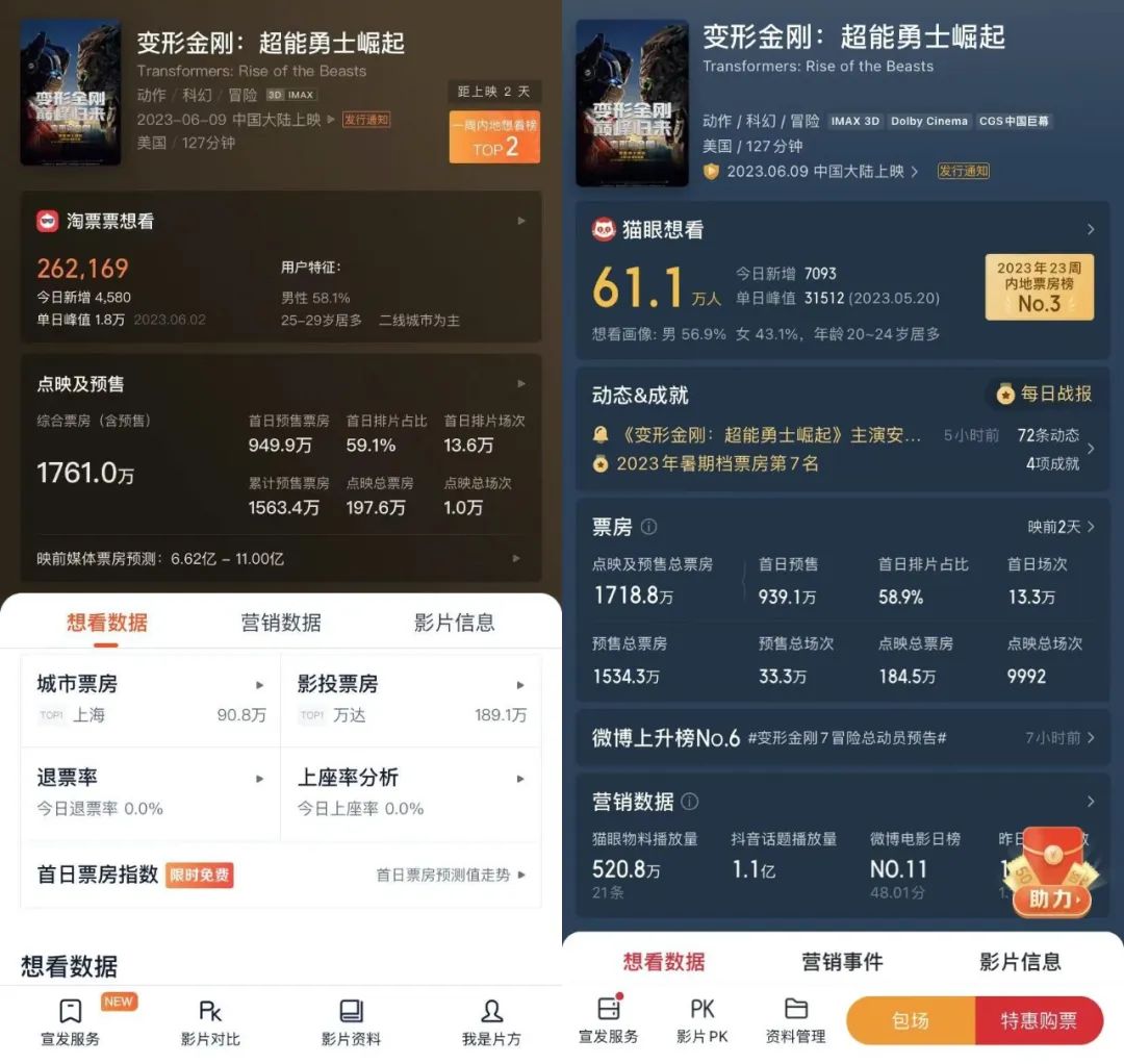 所以,《变形金刚:超能勇士崛起》能否激发新老用户群体的观影热潮,对宣发的挑战极大。从目前来看,派拉蒙和环球影业的中国宣发方面做的还不够,所以,预售的票房的预期都没有那么高,灯塔专业版的预测是6.62亿~11亿,猫眼专业版的想看人数61万——想要达到变4和变5的票房成绩还是有一定挑战的,但比《蜘蛛侠 纵横宇宙》的票房表现肯定是要好的。