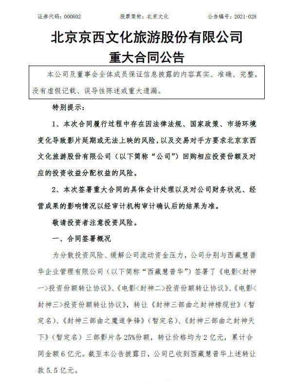 此外, 4月21日北京文化曾发布《重大合同公告》,称为了分散投资风险、缓解公司流动资金压力,分别与西藏慧普华企业管理有限公司签署了《电影、、投资份额转让协议》,转让《封神三部曲》三部影片各25%份额,转让价格均为2亿元,累积合同金额6亿元——也就是说,这个系列在受让方看来,标的价值约为24亿,这或许也是封神系列的真实成本。