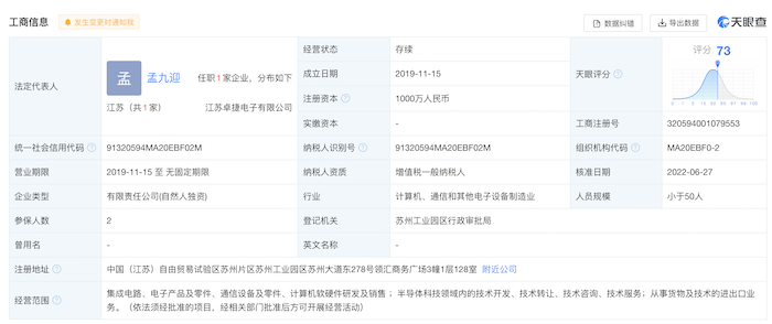 值得注意的是,天眼查显示,公司前五大经销商之一的江苏卓捷电子有限公司(下称:江苏卓捷)于2019年11月15日才成立,注册资本为1000万元,但并未实缴资本,该公司的参保人数仅2人。