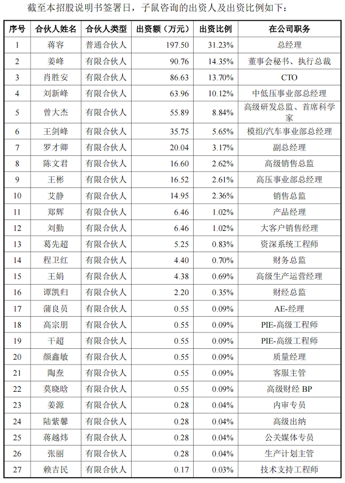 据招股书披露,子鼠咨询共27名出资人,其中19人的出资比例不超3%。出资比例超过10%的只有在公司任总经理的蒋容(出资比例31.23%)、董秘姜峰(出资比例14.35%)、CTO肖胜安(出资比例13.70%)及中低压事业部总经理刘新峰(出资比例10.12%),合计占比69.40%,系三次股权激励的主要受益人。