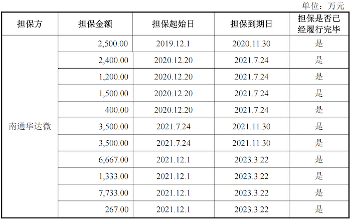 此外,华达微2019年及2021年间频繁为尚阳通提供关联方担保,金额合计高达2.75亿元。具体为,华达微向华虹宏力出具担保函承诺在担保金额范围内为公司提供担保,如尚阳通出现延迟付款情形,华达微愿意承担付款义务。根据双方协议,尚阳通按照华达微实际担保金额的1%向其支付担保费。