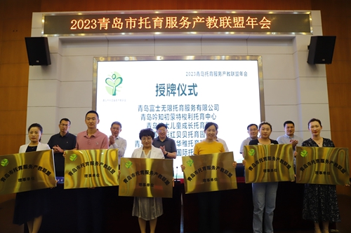 王金生与杜维平等与会领导为2023年新加入“青岛托育服务产教联盟”的13家理事单位授牌,并为首届“苗圃杯”托育服务典型案例中的获奖案例颁奖。