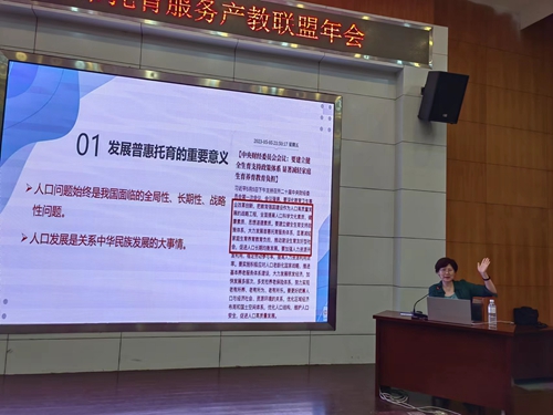 杜维平代表青岛市卫健委致辞。他对此次年会的举办表示高度的认可,强调了近年来国家对于婴幼儿托育服务工作的关注和支持,详细介绍了青岛市托育行业的情况、已开展的有效做法及未来建设规划。他指出,托育服务产业正处于转型升级的关键时期,青岛职业技术学院牵头成立的托育服务产教联盟,在专业人才培养、优化整合资源、加强托育服务机构的规范化建设,推进托育服务的普及和发展等方面,成为青岛市托育服务事业的重要力量。他希望联盟继续发挥成员优势,推动“政、校、企、研”的托育人才培养和产教融合平台建设,实现优势互补、资源共享,为青岛市的人口均衡发展和托育服务业健康发展作出积极贡献。