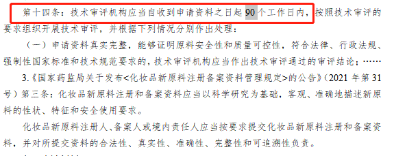此外,风险程度较高的化妆品新原料注册审批办事指南还表示,国家药品监督管理局应当自收到技术审评结论之日起20个工作日内,对技术审评程序和结论的合法性、规范性以及完整性进行审查,并作出是否准予注册的决定。