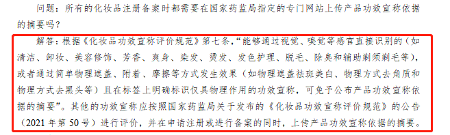 此外,《办事指南》还明确指出,根据《化妆品功效宣称评价规范》第七条,“能够通过视觉、嗅觉等感官直接识别的,或者通过简单物理遮盖、附着、摩擦等方式发生效果,且在标签上明确标识仅具物理作用的功效宣称,可免予公布产品功效宣称依据的摘要”。其他的功效宣称应按照国家药监局关于发布的《化妆品功效宣称评价规范》的公告(2021年第50号)进行评价,并在申请注册或进行备案的同时,上传产品功效宣称依据的摘要。