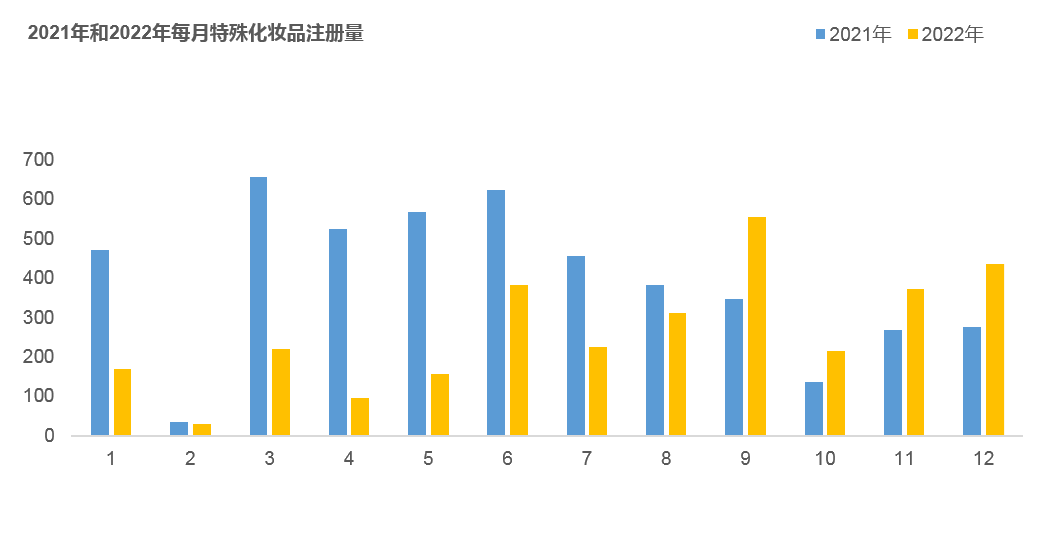 相较于2021年特殊化妆品注册量数据,2022年特殊化妆品注册量有所下降,约为2021年特殊化妆品注册总量的79.3%。其中,进口特殊化妆品注册量下降明显,仅为2021年进口特殊化妆品注册总量的35%,国产特殊化妆品注册量则与2021年注册量基本持平。可见,在人体功效评价试验、产品安全评估资料等多种因素的影响之下,企业无论是时间成本、经济成本,还是机会成本都较高,才导致了特殊化妆品通过率较低。