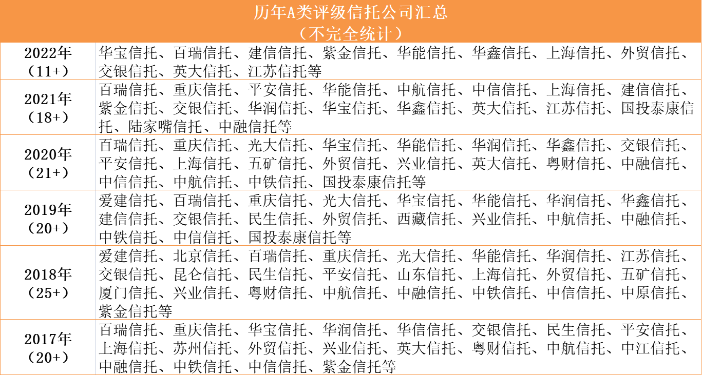 从历年评级情况看,虽然每年名单成员都有增有减,但自2017年以来,包括百瑞信托、华润信托、上海信托、交银国际信托等机构连续六年保持A评级。
