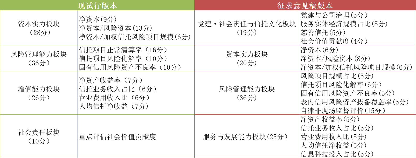 其中,四大板块更新为党建·社会责任与信托文化、资本实力、风险管理能力、服务与发展能力;原有11个指标中删除了信托项目正常清算率指标,同时增加了党建与公司治理、服务实体经济规模占比、慈善信托、风险项目规模占比、信用风险资产拨备覆盖率、自律检查中非现场检查占比、信息科技投入占比七个项目。