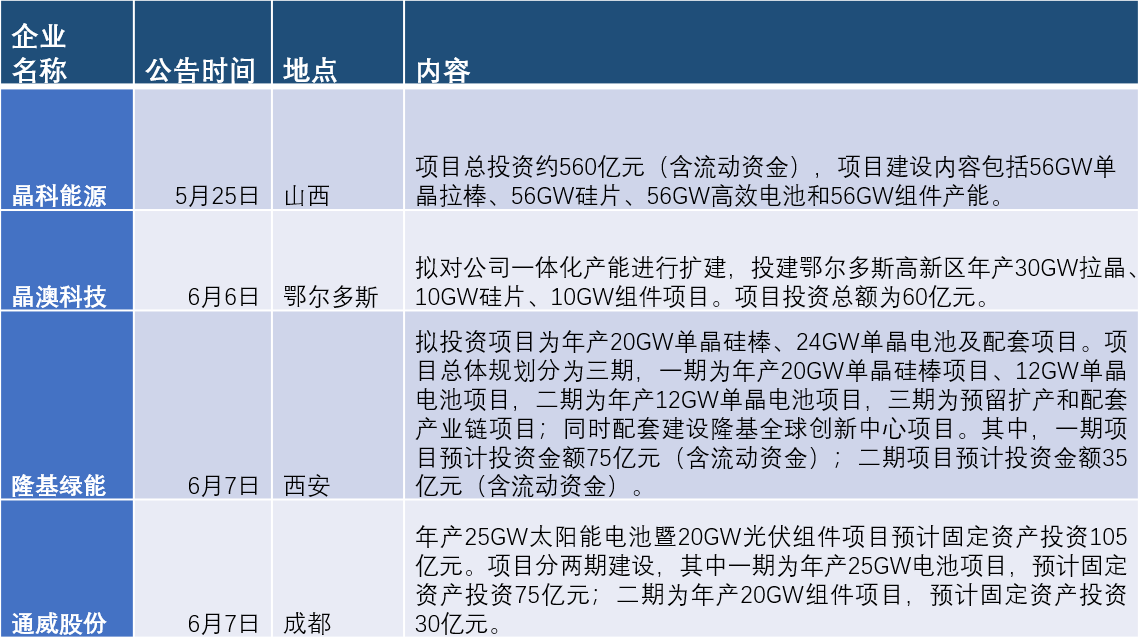 6月7日,隆基、通威两大巨头同时宣布扩产。两家扩产的区域,均是公司业务起家之地:隆基的项目在西安、通威的项目在成都。晶澳科技此次扩产的项目在鄂尔多斯,但是去年年底,晶澳科技宣布拟在石家庄高新技术产业开发区分期建设光伏切片、电池、组件一体化智能工厂及研发中心项目,总投资约102亿元。