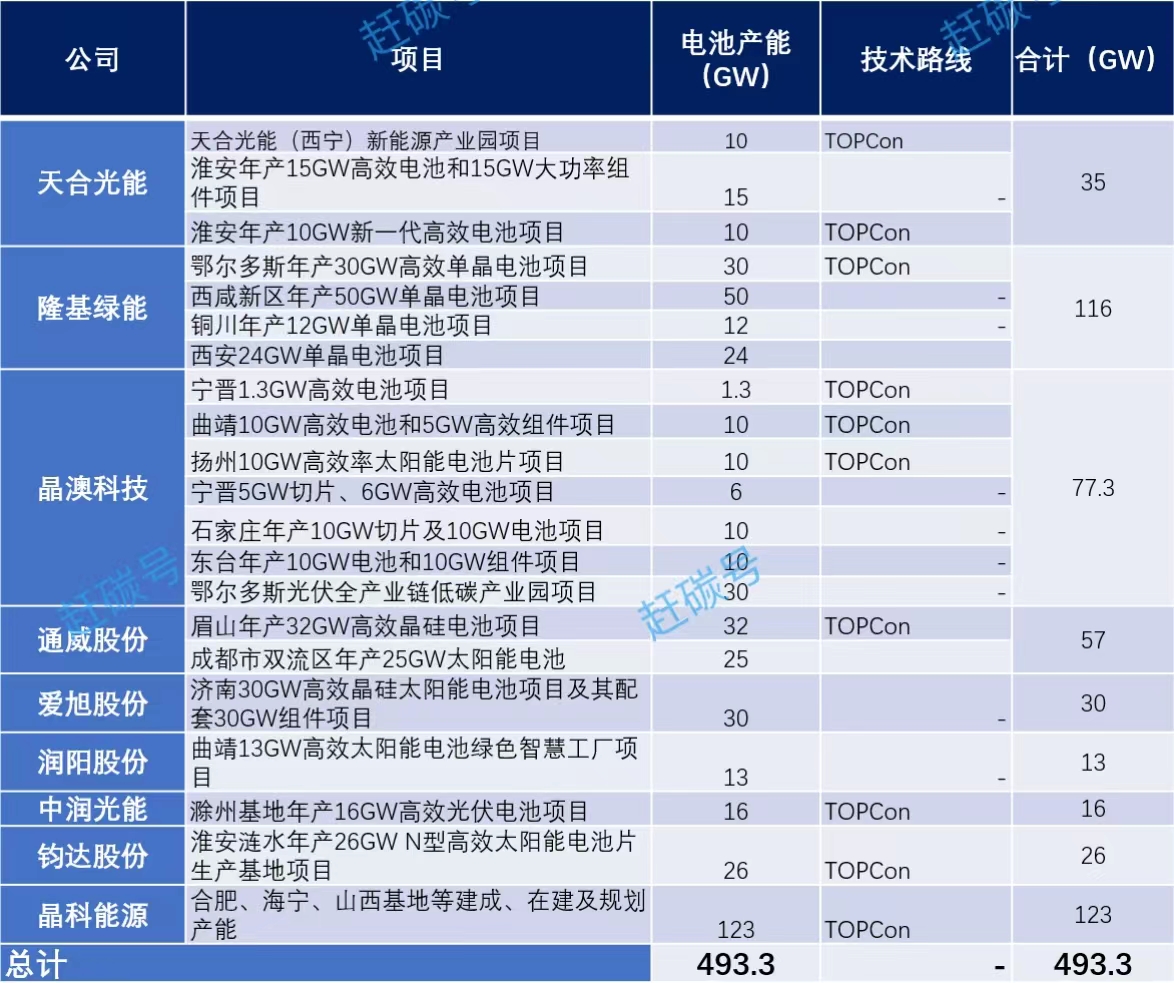 赶碳号梳理了2022年以来、已公开的头部光伏企业电池片的扩产计划,合计近500GW!