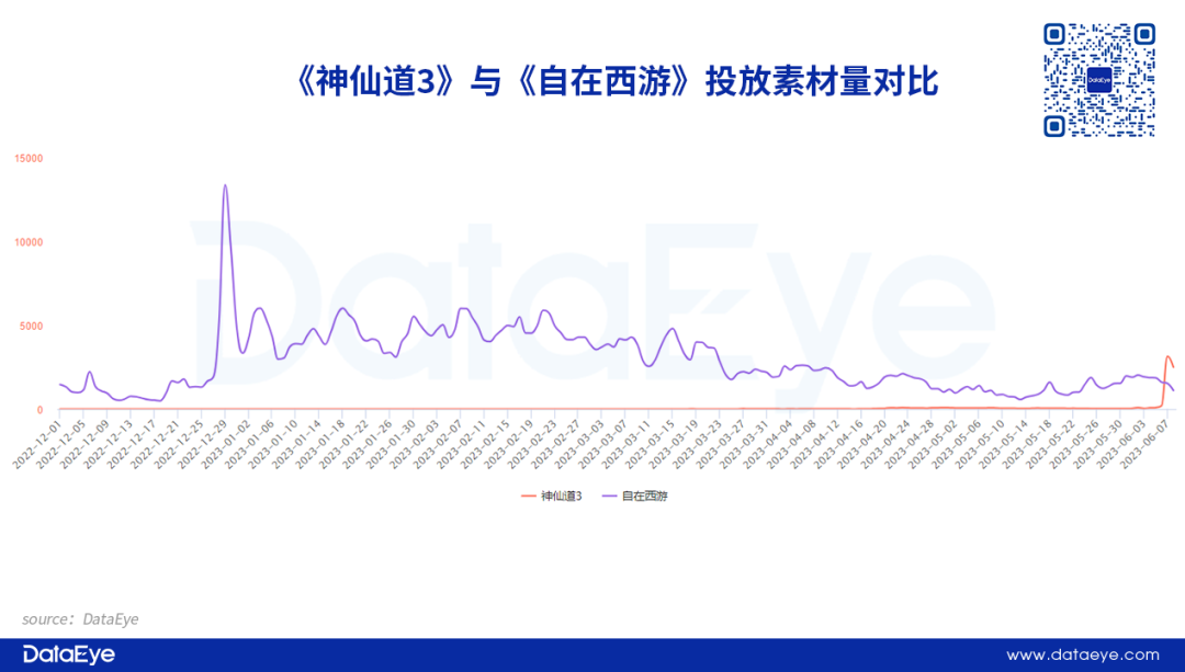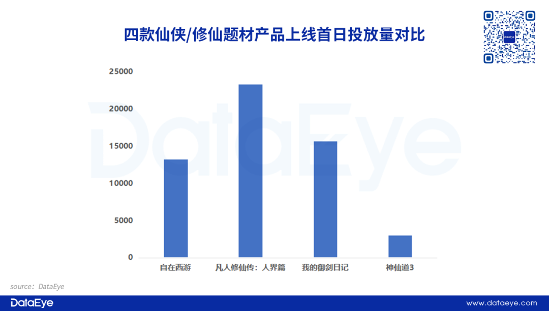 具体到投放量来看,《神仙道3》对比其他近期上线的多款同类型题材产品,整体投放量偏少,仅为《凡人修仙传:人界篇》的1/20。与《自在西游》首日投放量相比,也有一定的投放量差距。