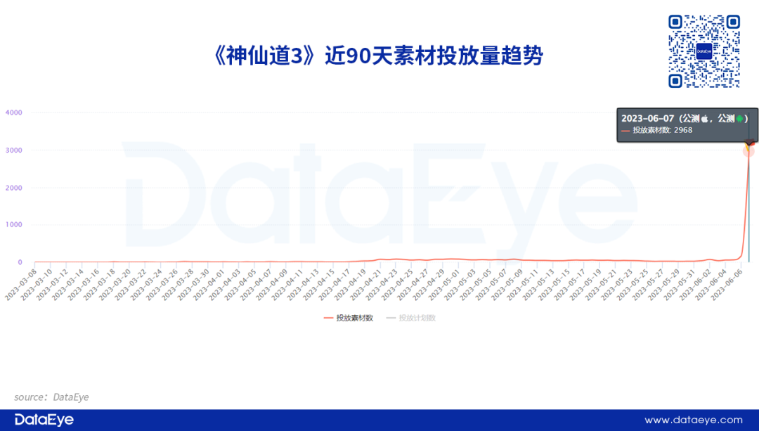 直到上线当天,项目组为配合产品宣发造势,提升投放量。DataEye-ADX投放数据显示,《神仙道3》上线首日投放2900多组素材。