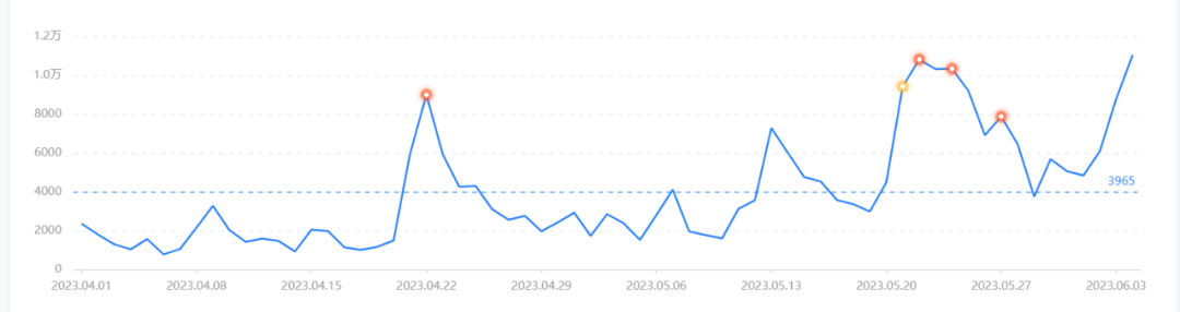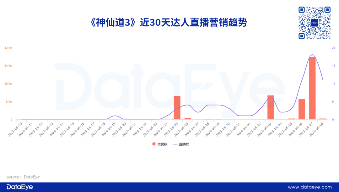 第三次攀升(6月3-4号):6月初接近产品公测上线阶段更新了发行人计划内容,增加相关营销预算。同时,项目组发起达人直播,为产品进行造势。根据DataEye-ADX达人营销数据显示,达人直播数量在6月初直线飙升。