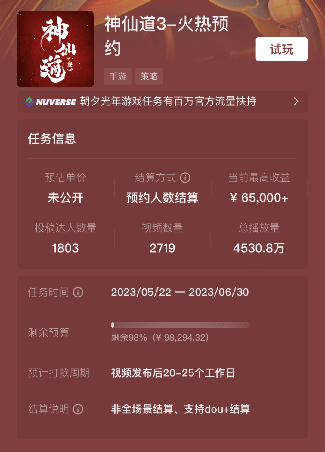 其二,发挥字节自家产品独家流量支持,吸引大量中腰部达人创作内容。产品未上线就发起抖音游戏发行人计划,项目组主要希望通过官方流量利好政策(朝夕光年游戏任务流量扶持政策),吸引到大量本身就需要流量的中腰部达人参与投放,而这类型达人特点明显,不仅数量多而且价格便宜。对于项目组来说,更多达人参与意味着有大量相关视频进入流量池,才能实现更多传播量以及产生触达目标用户的机会。