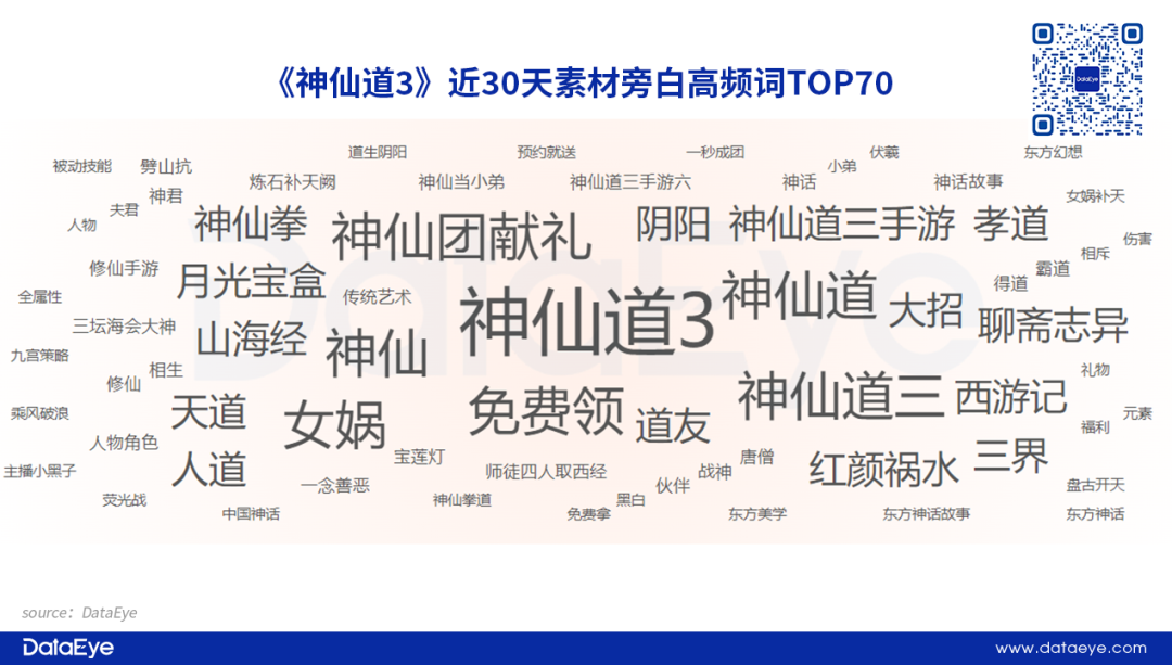 根据DataEye-Tidea旁白高频词TOP70数据,项目组近30天主要突出“神仙团献礼”“免费领”等福利卖点。同时,“女娲”“神仙”“道友”等题材卖点词频同样较高。