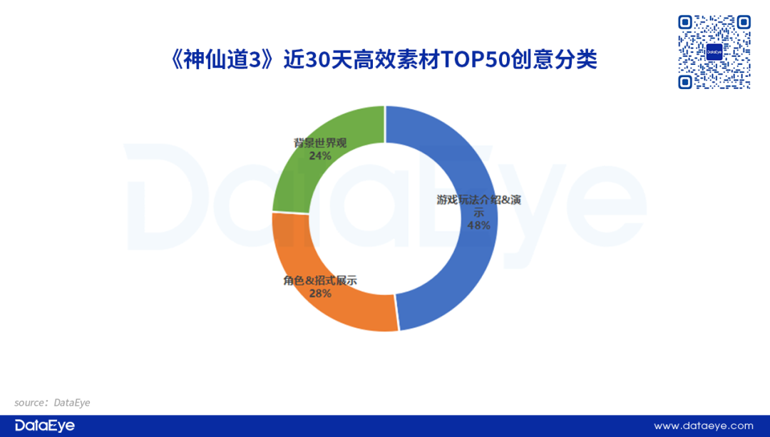 创意类型方面,《神仙道3》高效素材TOP50主要分为:角色&招式展示、背景世界观以及游戏玩法介绍&演示等三种创意类型。