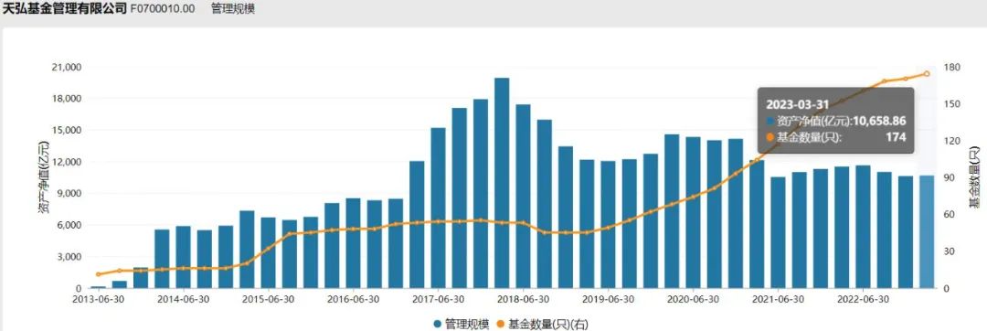 截至一季度末,天弘基金在管基金数量174只(同类基金合并计算),同比增加22只。其中债券型基金53只,同比增加12只;股票型基金67只,同比增长8只。在管基金净资产规模1.07万亿元,其中货币型基金规模达7753.78亿元,占总规模的比例超过75%;权益指数型基金总规模超过825亿元,占比约8%。