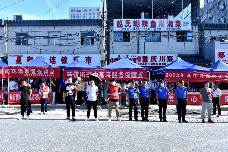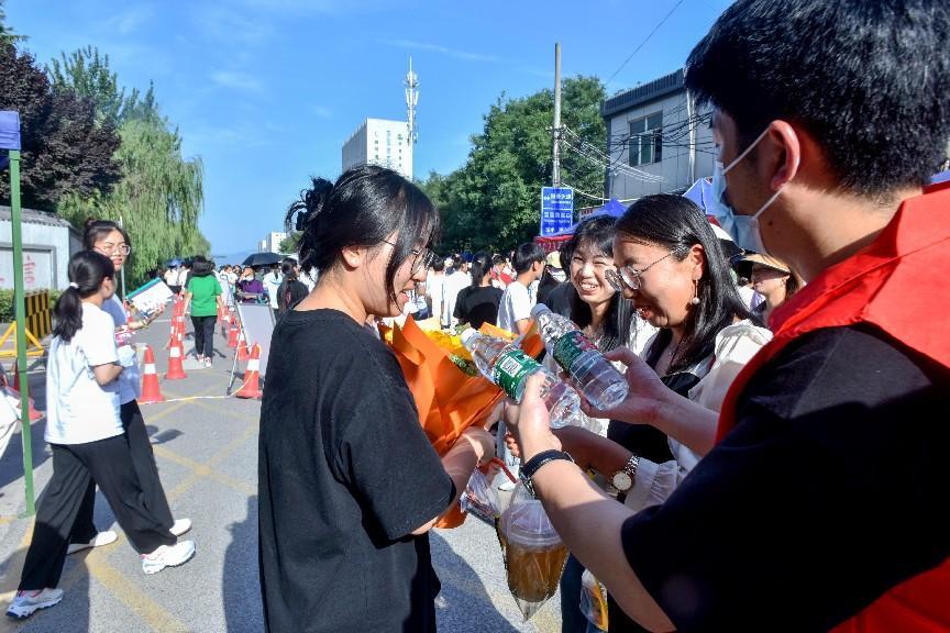 考场外,随处可见公安、交警、城管全力维护考场周边秩序,几名身着长安号志愿服务队红马甲的青年,或协助公安部门维持秩序,或给考生家长送水,以“志愿红”护航高考。