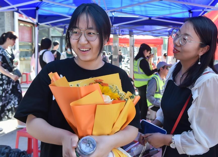送花、拥抱、合影留念……当日17时,在西安国际港务区实验中学考点前,候考的家长们翘首以盼,用各种方式迎接考生。