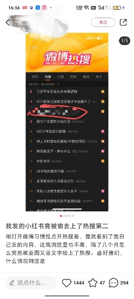 来自河南郑州的小王就发过小红书吐槽,她曾经在小红书上发过一篇笔记,原本在小红书浏览量并不出众,但在几个月后被某个自媒体博主搬运到了微博,还冲上了总榜热搜第二。