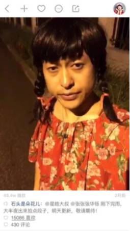 知道石头是朵花是从他反串造型的段子开始的,在他的段子里,总是穿着一身大花被面做的衣服,以一个残障女性形象演绎着恶俗的小段子。当然在这个过程中,他也吸到了一些粉丝,不过逐渐的也开始走下坡路,段子更新的越来越多,但内容却越来越无聊,要不靠着人声效果器的支持,还真就无法粉丝老爷们嘴角哪怕一丁点的上扬。