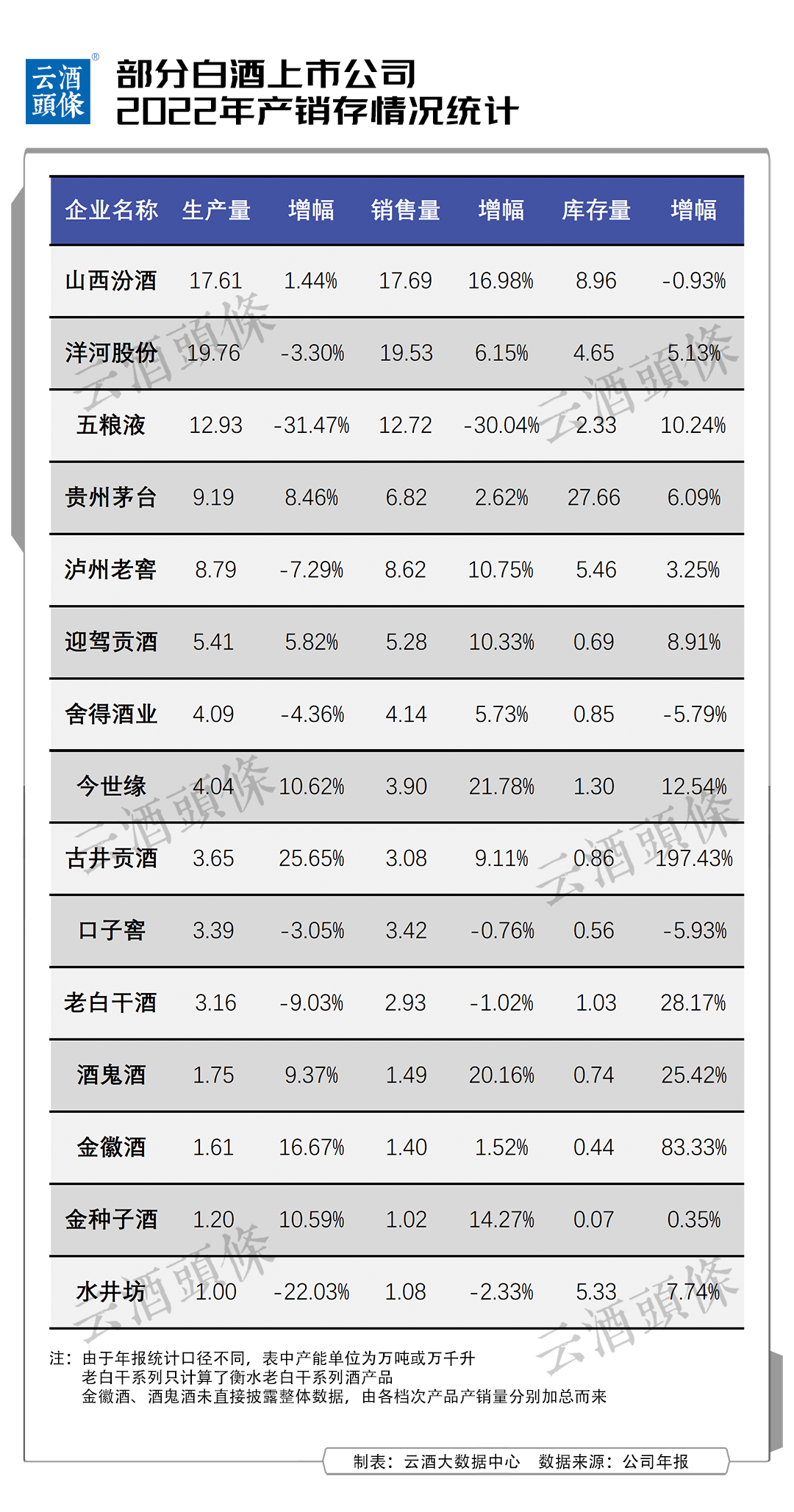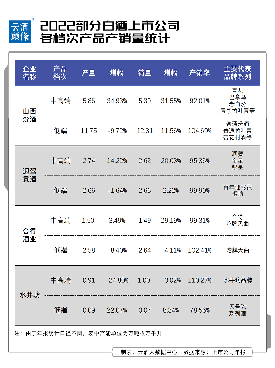 迎驾贡酒与舍得酒业的情况与山西汾酒类似,都是中高端产品产量增加,而低端产品产量减少;水井坊则表现得更为理性,其中高端产品的产销率达到110.27%。