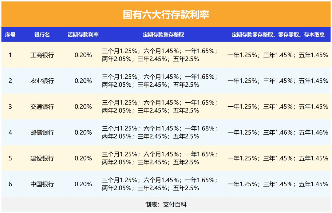 同天发布公告的工行、中行、建行、交行、邮储银行对人民币存款利率也进行了调整,活期存款利率统一下调至0.2%,长期存款利率全部降至2.5%以下(含2.5%),六大行中整存整取利率已基本统一。