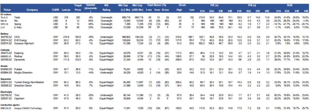摩根斯坦利指出,年初将宁德时代上调至 EW(持平),同时仍看空大多数电池材料厂商。这是因为摩根斯坦利相信,只有具有成本优势和强大议价能力的行业领导者才能经受住行业逆风(需求增长放缓以及电池和电池材料产能快速增长)。宁德时代年初至今的股价表现也符合这一论点,大多数电池材料公司的股价大幅下跌,而宁德时代的股价仍保持弹性。