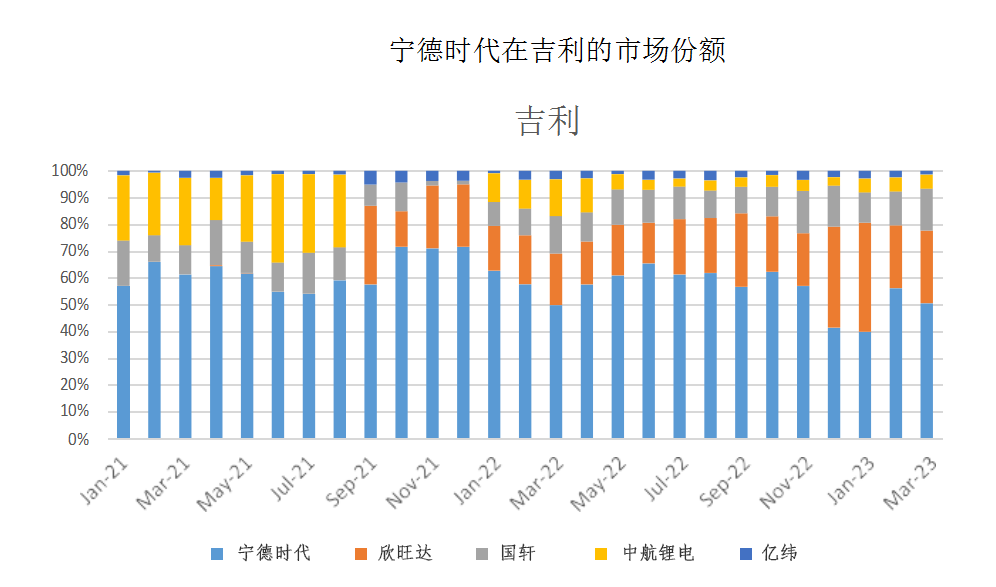 2023 年 4 月,根据 SNE 数据,摩根斯坦利评估宁德时代的国内市场份额下降至 46%(3 月:51%),其在除比亚迪之外的国内市场份额也收缩至 59%(3 月:64%)。由于来自二线电池制造商的竞争加剧,因此将宁德时代 2023 年的市场份额预测从 55% 下调至 47%,并将长期预测下调至 40%(从 45%),将宁德时代全球范围内的长期市场份额从之前的 30% 下调至 25%,这一数据明显低于市场预期的 >30% 。