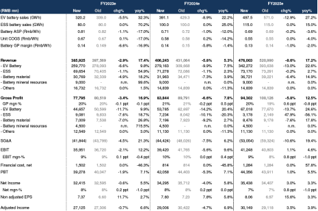 然而,由于现在预计二线电池制造商将采取更激进的定价策略,宁德时代可能不得不效仿。因此,他们将2023-24年电动汽车电池单元GP预测进一步下调~6%至~Rmb0.14/Wh。